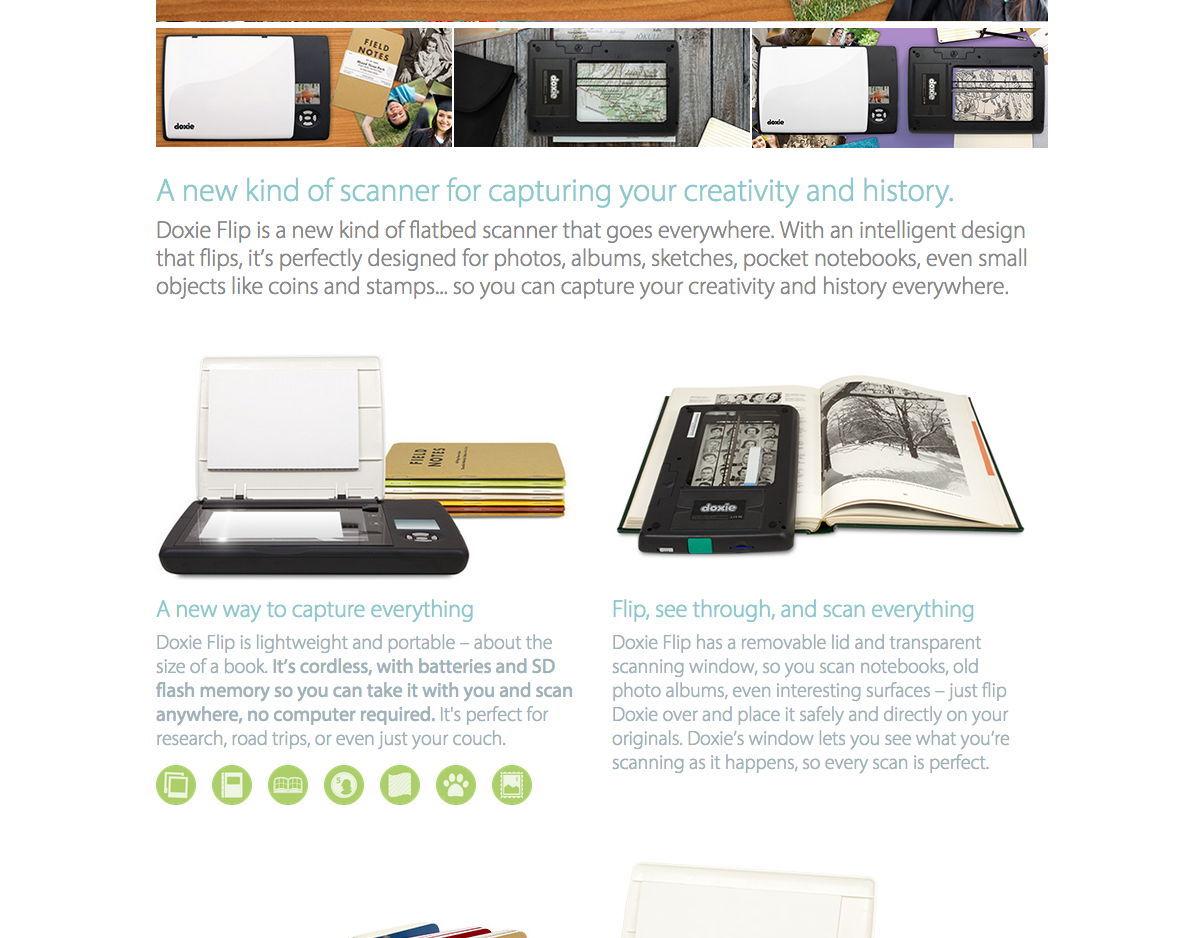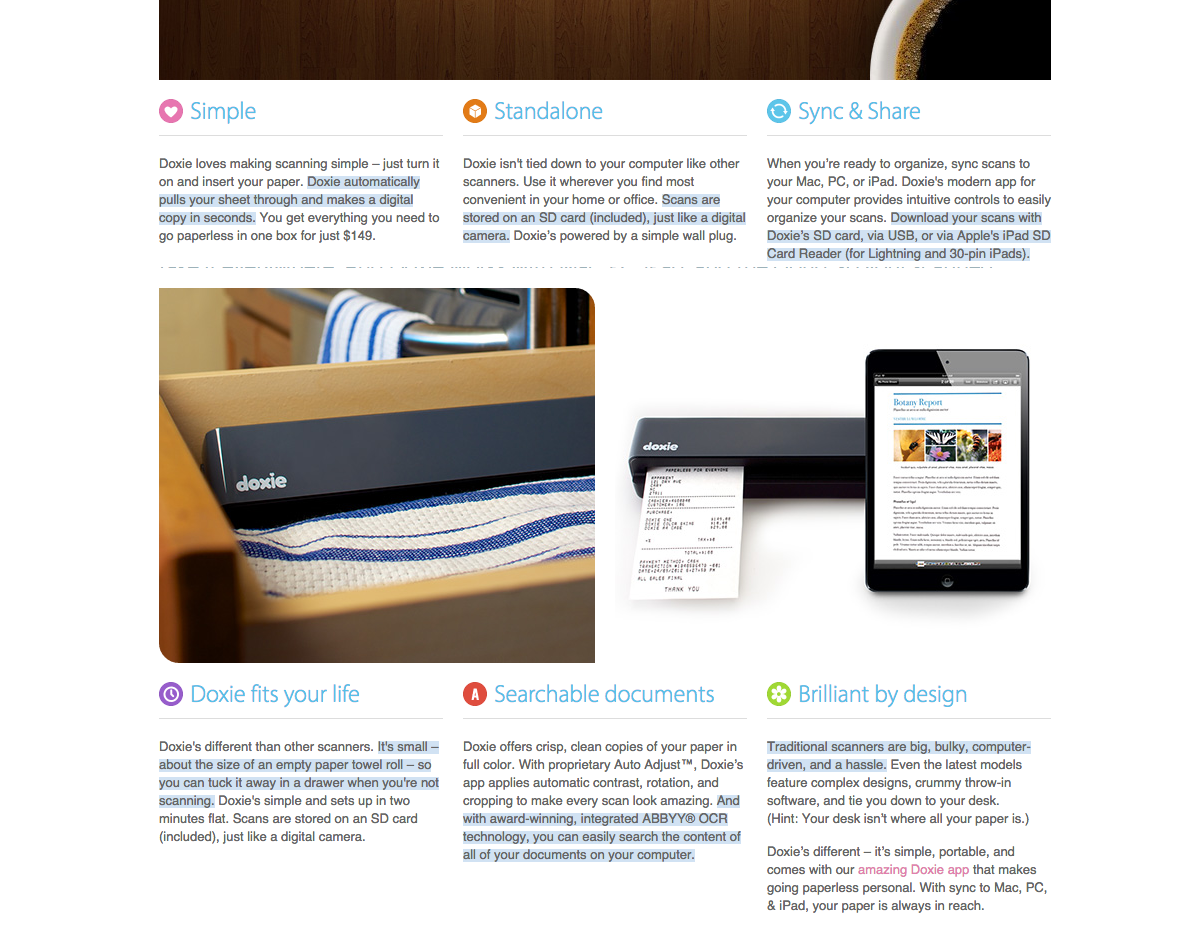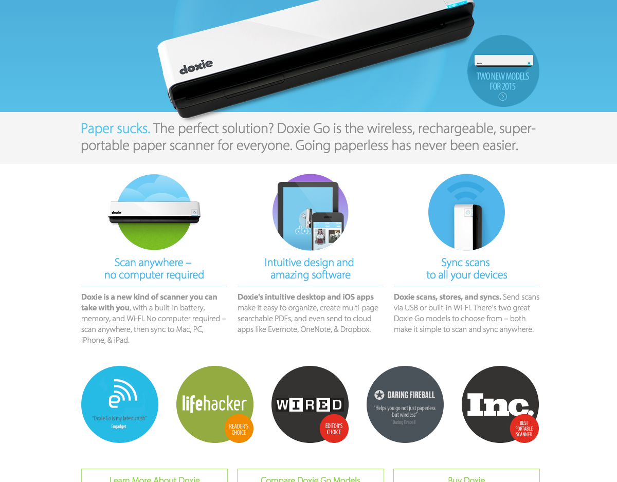 Product site created for the launch of the Doxie Go Wi-Fi in 2014. Doxie Go Wi-Fi is a portable document scanner with built-in Wi-Fi that makes scanning paper, documents and photos a breeze.