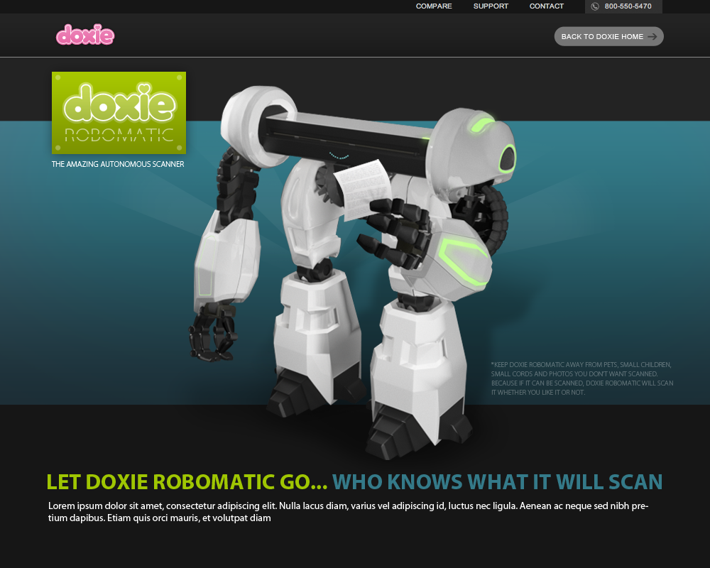 In 2012, with the launch of the Doxie Go, whose main tagline was "Scan Anywhere", I imagined a scanner that you wouldn't take with you, but would scan autonomously-- going around your home or office, finding whatever it could fit in its face and scanning it, whether you wanted it to or not. The Doxie Robomatic was meant to be an April Fool's Day campaign to follow up on the Doxie Go, taking scanning to the next futuristic level.